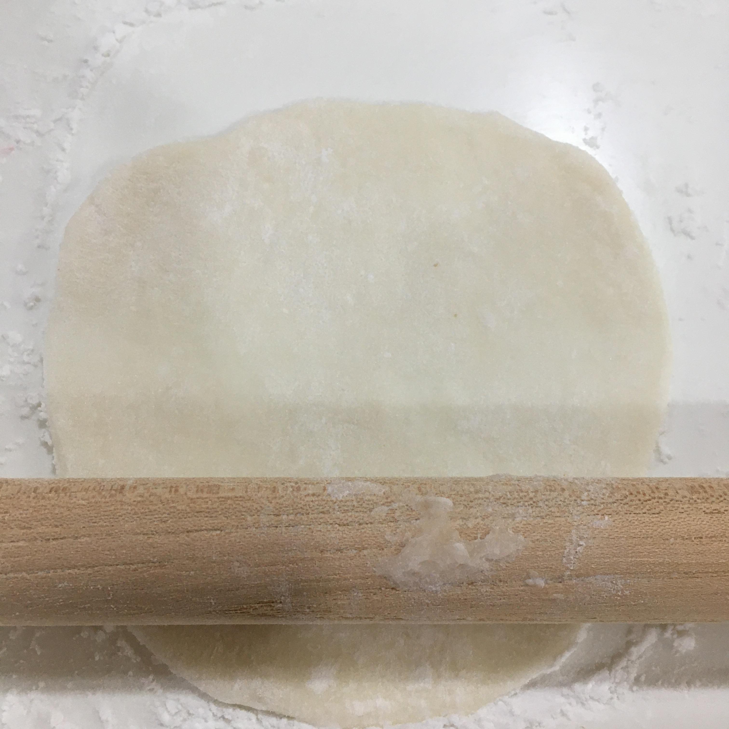 반죽 하나를 동글동글 만들어서 쟁반에 놓고 밀대에 전분가루를 묻힌 후 밀대로 밀어줬어요.